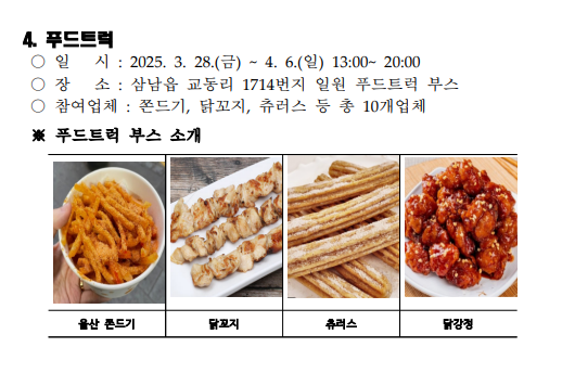 - 푸드트럭존: 벚꽃을 테마로 한 다양한 먹거리(벚꽃 와플, 벚꽃 라떼 등)를 즐길 수 있습니다.