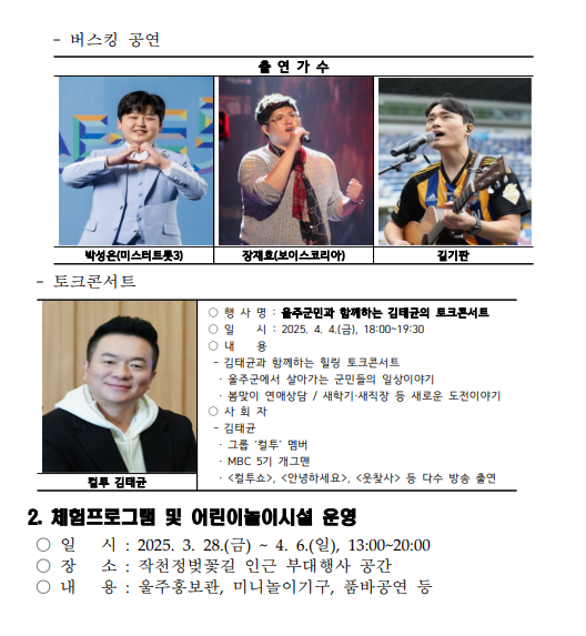 - 축하공연: 인기 가수들과 지역 예술가들이 참여하여 축제의 열기를 더할 예정입니다.