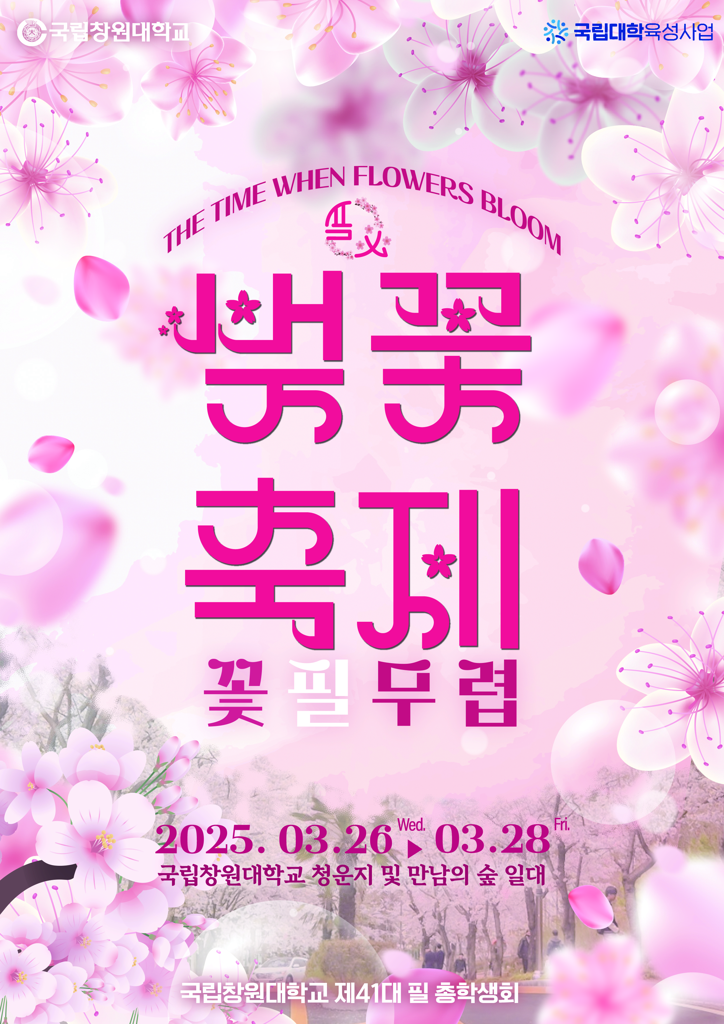 이 시기는 창원의 벚꽃이 절정을 이루는 시기로, 교정 곳곳에서 만개한 벚꽃을 감상할 수 있습니다. 이번 2025년 벚꽃축제는 3월 26일부터 28일까지 열리며, 학생생활관 앞 연못 청운지, 대운동장, 만남의 숲 등에서 다양한 프로그램이 진행될 예정입니다.