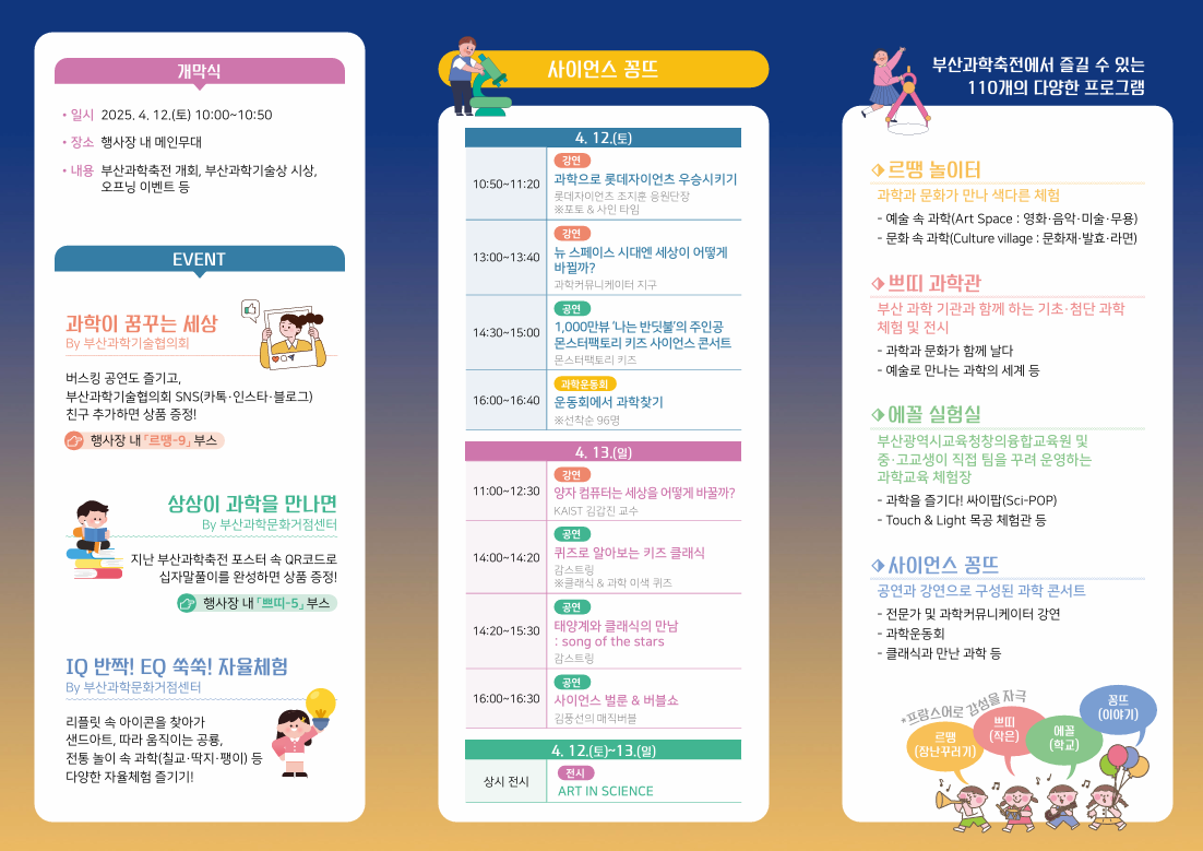 제24회 부산과학축전은 다양한 연령층이 즐길 수 있는 풍성한 프로그램을 준비하고 있습니다. 주요 프로그램은 다음과 같습니다: