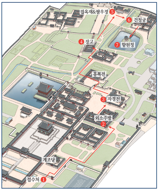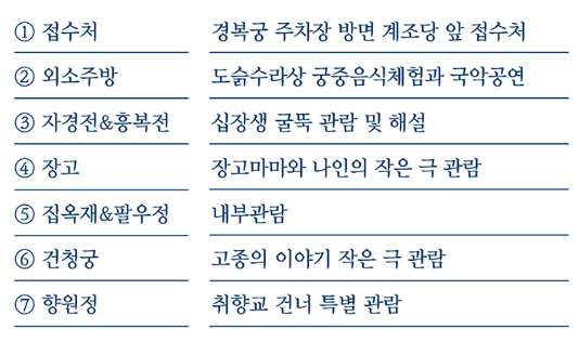 ①경복궁주차장 방면 계조당 앞(집결) → ②외소주방(궁중음식 체험 및 국악공연 관람) → ③자경전→ ④장고→ ⑤집옥재·팔우정 → ⑥건청궁 → ⑦향원정