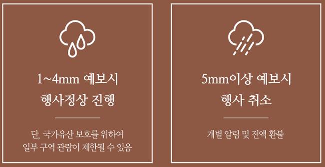 - 편한 복장 착용: 궁궐 내 돌길이 많으므로 편한 신발과 따뜻한 외투를 착용하시기 바랍니다.