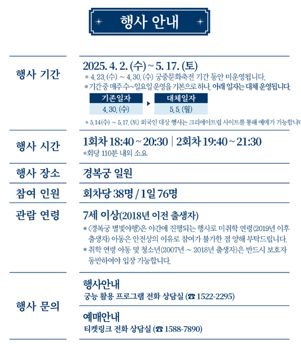 - 단, 4월 23일(수) ~ 4월 30일(수) 궁중문화축전 기간 중에는 운영하지 않으며, 4월 30일(수) 행사는 5월 5일(월)로 대체 운영됩니다.