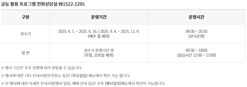 - 문의 전화: 궁능 활용 프로그램 상담실 ☎️ 1522-2295