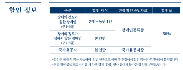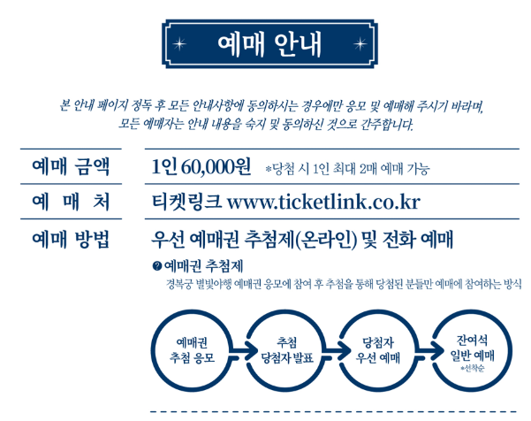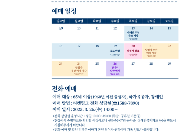 - 예매 방식: 온라인 예매권 추첨제 및 전화 예매