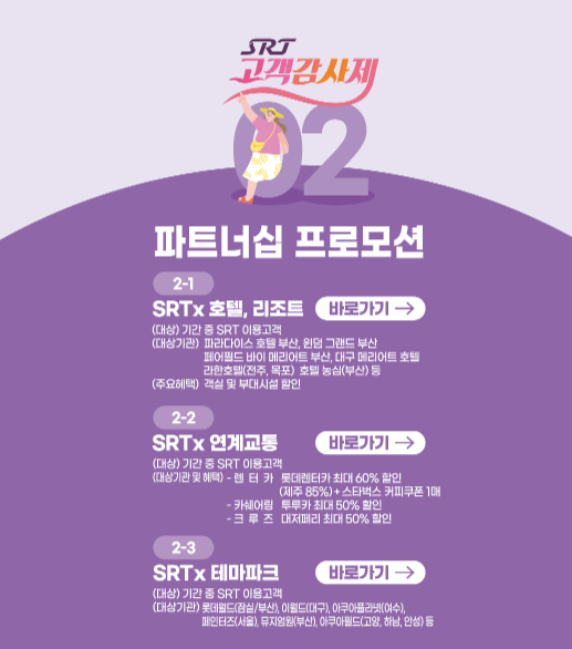 - 카드사 제휴 할인: SRT 제휴 카드로 결제 시 할인